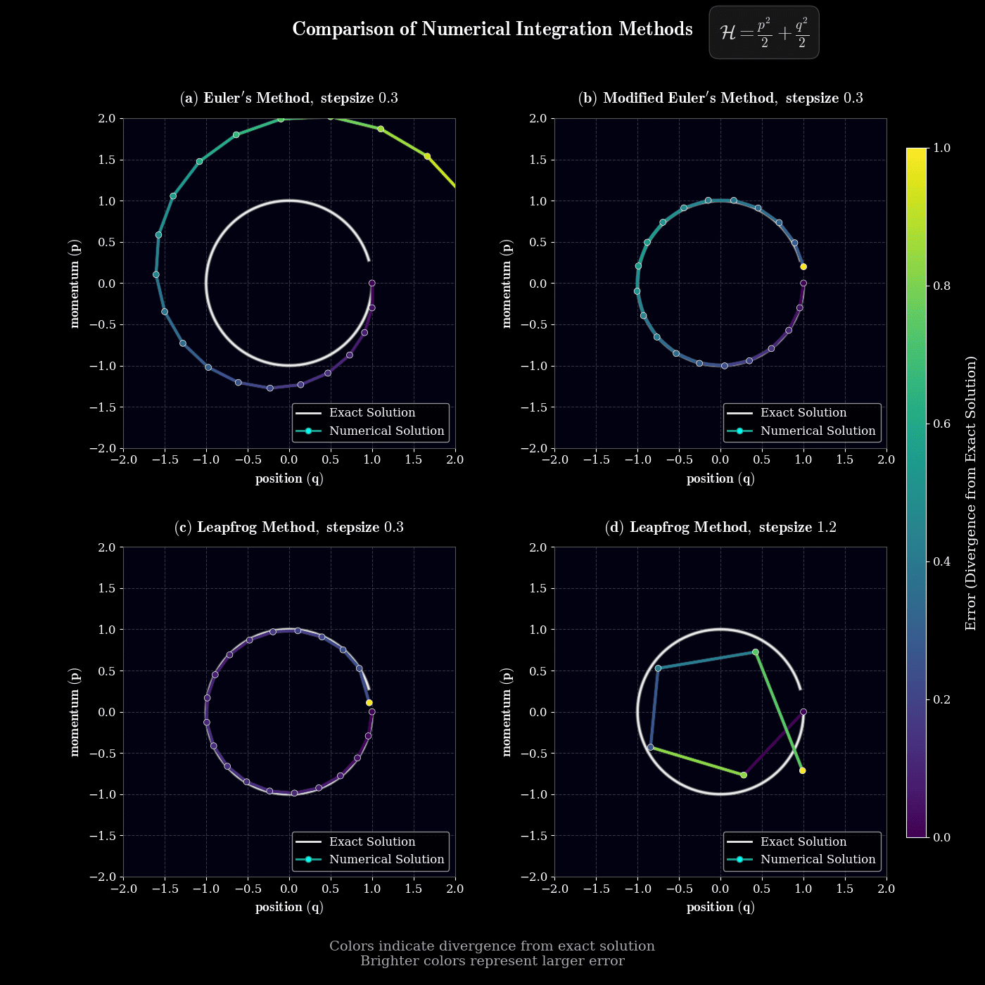 Euler's method (first-order) systematically injects energy into the system, causing the characteristic outward spiral seen in the plots. Modified Euler's method (second-order) significantly reduces this energy drift. Most importantly, symplectic integrators like the Leapfrog method preserve the geometric structure of Hamiltonian systems even with relatively large step sizes by maintaining phase space volume conservation. This structural preservation is why Leapfrog remains the preferred method for long-time simulations in molecular dynamics and astronomy, where energy conservation is critical despite the visible polygon-like discretization artifacts at large step sizes.