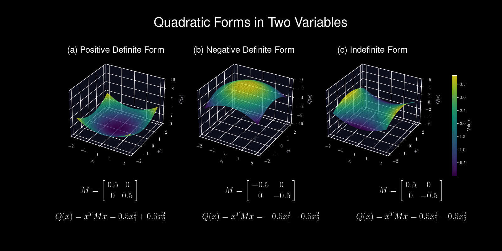 Each subplot includes the matrix \( M \) and the corresponding quadratic form \( Q(x) = x^T M x \).